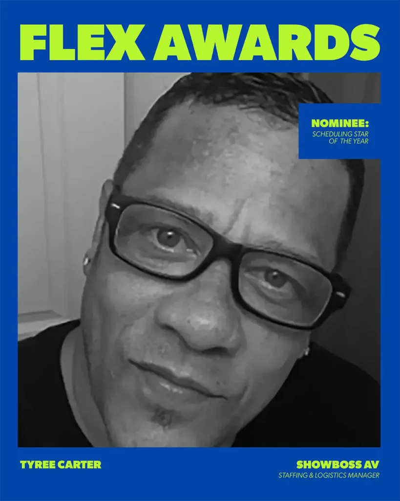 Tyree Carter is nominated for Scheduling Star as part of the Flex Awards. The Flex Awards celebrate the professionals behind the scenes who keep live events moving and make complex productions feel seamless. To learn more about the program and this year’s finalists, visit FlexRentalSolutions.com/Flex-Awards.